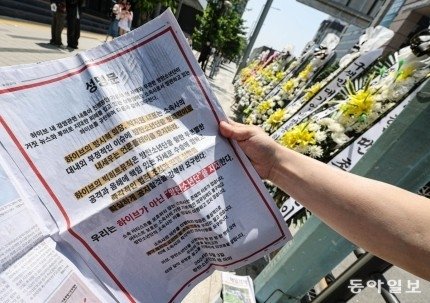 주최자에게 고용돼 근조화환을 지키고 있다는 한 관계자는 “근조화환은 오전에 세워졌고, 취재진에게 성명문이 광고로 실린 신문을 보여주라는 요청이 있었다”라며 신문을 펼쳐 보였다. 해당 광고에는 “방탄소년단을 방패막이로 내세우는 언론플레이를 중지하라”, “방탄소년단을 향한 무분별한 공격과 음해에 책임 있는 자세로 수습에 임하고 즉각적인 법적 조치와 진행 상황 공지를 요구한다” 등 방탄소년단 아미의 성명문이 게재됐다.
