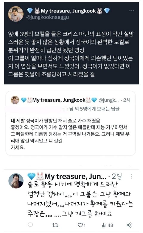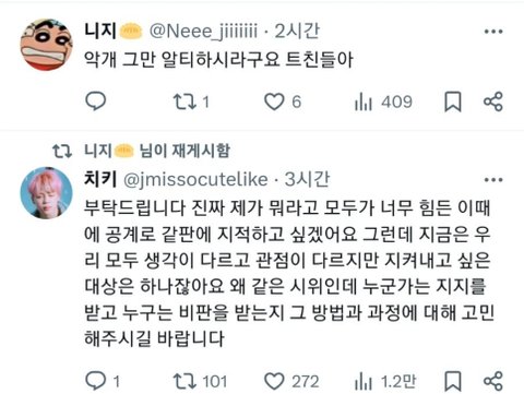 이와중에도 본인최애만 소중해서 그룹팬들 조심스럽게 총공하는거에 꼽껴서 올팬들 화력빌려서 저러는거 진짜 ㅈㄴ양심없능거 개짜친다
