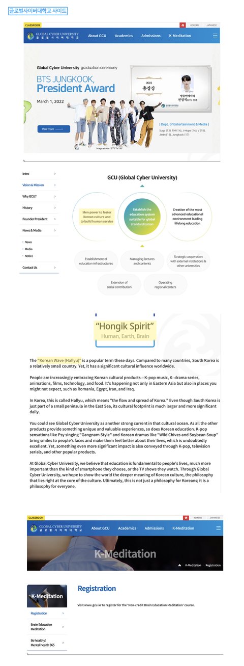 “Vision & Mission”에서 홍익인간과 한류에 대한 학교의 비전을 엿볼 수 있음