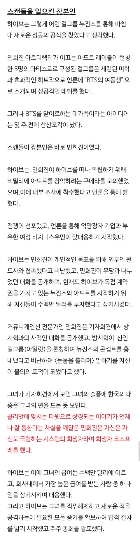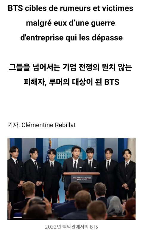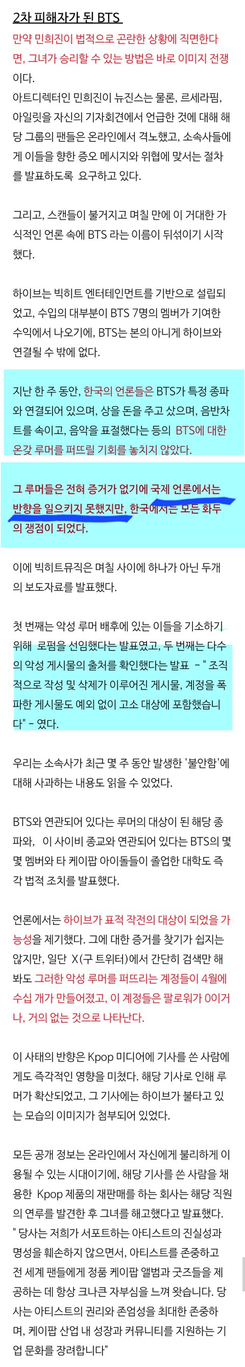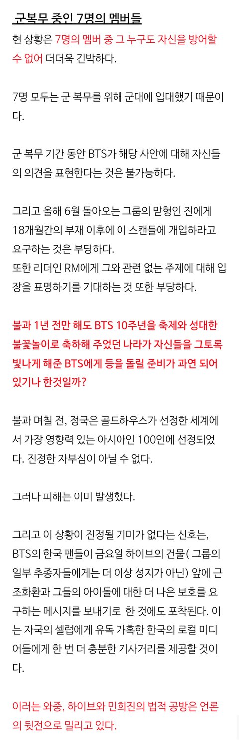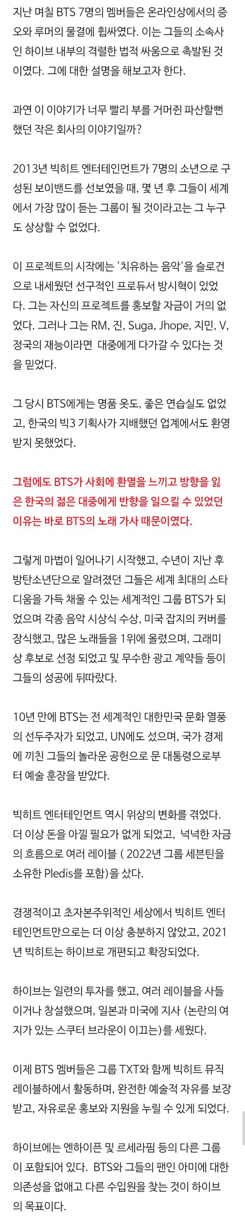 방시혁 민희진 기업전쟁 사이에 포커스가 방탄으로 옮겨지고 집중포화를 맞았던 기간동안 하이브 방시혁 모두 대응을 하지 않고 있음 지금까지의 상황정리와 한국아미들이 집단행동을 하는 이유가 잘 서술 돼 있고 해외에서 이번일을 어떻게 보는지 해외에서 보는 시각이 잘 담겨있는것 같음 이 기사를 보고서야 해외아미들도 한국에서 돌아가는 상황을 이해하고 다들 개빡쳐있음