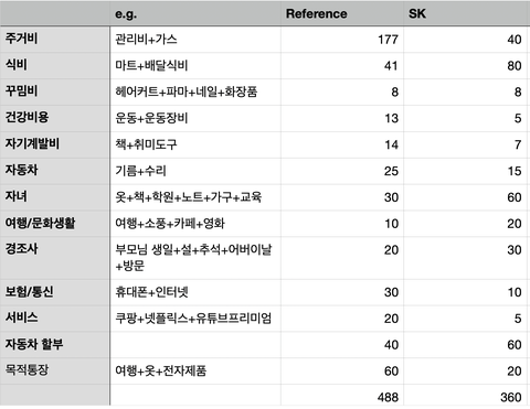 Reference 는 제가 참고로 한 블로거의 예산이고요, 우측 SK 가 저와 와이프가 상의해서 만든 수치로 한달 360만원 지출에 맞췄습니다.