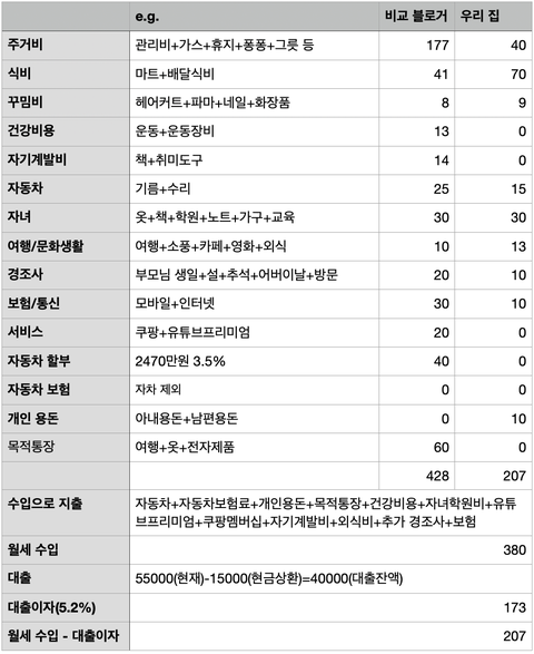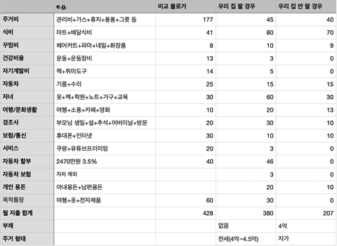 댓글 말씀처럼 집을 팔지 않고 빚을 일부 상환한 상태에서 예산을 잡아봤습니다. 207만원으로 생활해야 하는데, 휴우...