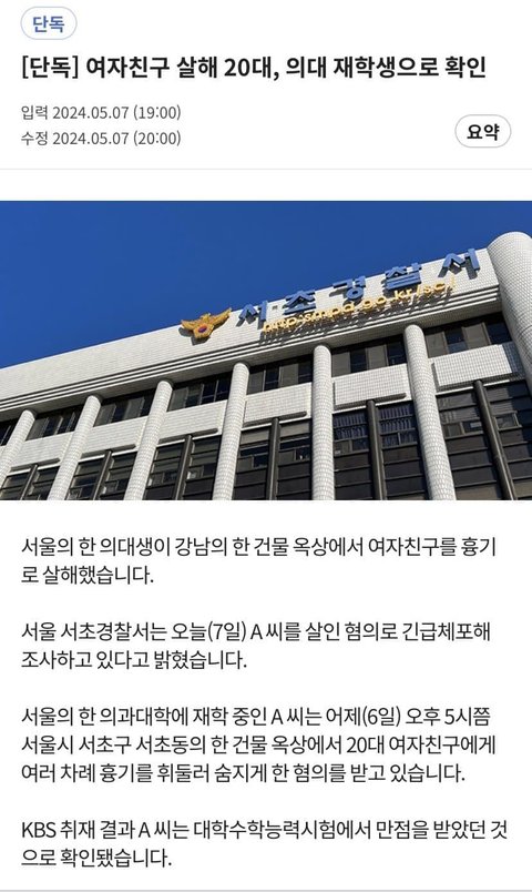 수능만점자 출신 의대생이 여친 살해했대