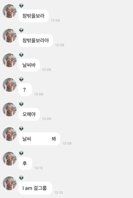 윈터는 "오해야"라며 "날씨 봐"라고 긴 띄어쓰기를 해 비속어가 아님을 강조했다. 놀란 윈터는 "후. I am 걸그룹"이라고 남겨 팬들에게 웃음을 선사했다.