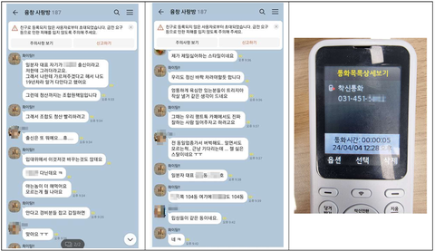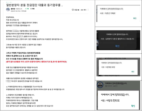 심지어 조합 직원은 조합의 지위를 이용하여 알게 된 조합원 연락처로 190명에 달하는 카카오톡방을 비밀리에 만들어 제 분양받은 동호수를 공개하고 제가 카페운영을 통하여 무엇인가 개인 사익을 추구하려고 한다고 허위사실을 전달하여 저를 범죄자인 양 만들어 그들로 하여금 신변의 위협을 느끼게 만들고 있으며, 조합의 전화로 제 회사의 직통번호로 전화하여 제 이름과 목소리만 듣고 끊는 등의 행위를 하고 있습니다.