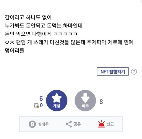 유주 안티냐? ㅋㅋㅋ유주 영입하는거 유주 혼자서 결정한다고 해서 들어오는게 아닌데 거기 회사직원들이 상의하고 들어온건데 유주탓하나네 그리고 버디가 진상이라고?? 애초에 대표면서 이적하나 공지 못하는 게 이상한거 아님? 적자도 유주탓.. ㅋㅋㅋㅋ