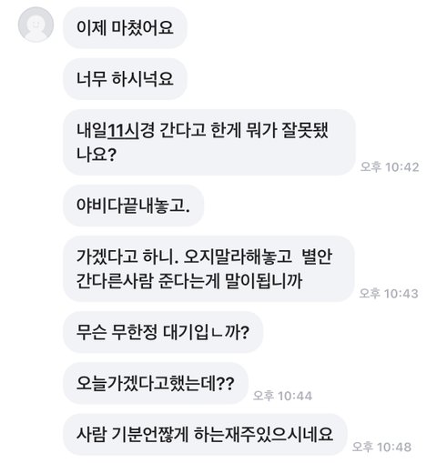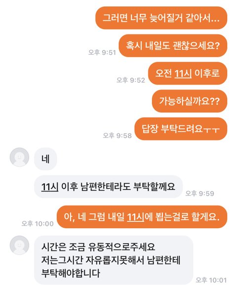 그런상황에서 답장도 계속 늦어, 최대한 시간을 맞춰드리겠다고 하는데도 정확하게 시간도 지정 안하니,