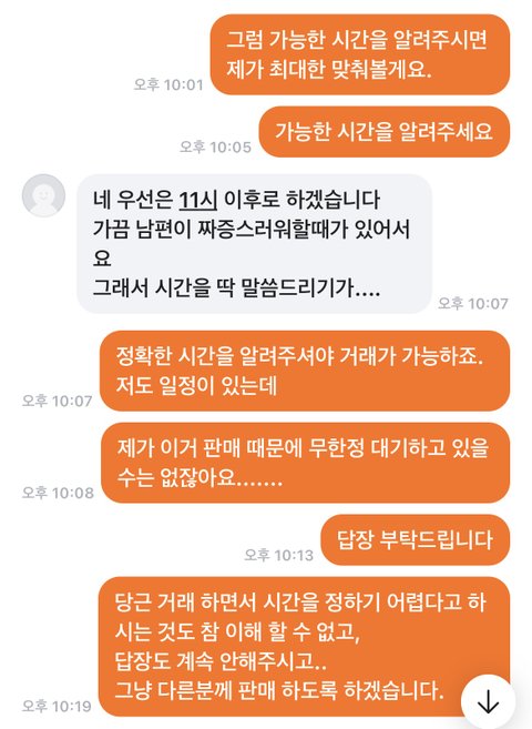 보통 구매 원하는 사람이 본인 상황이 문자 가능할때 연락 하는게 맞지 않나요?? 5분 지났는데 성격 급하다고 하시는데, 대화 한 번 하고--기다리고---또 한마디 하고 ---몇분 기다리니....그래서 결국 저 몇마디 오가는데 40-50분 정도가 걸렸는데... 그래더 제가 너무 심하게 재촉 한건가요??
