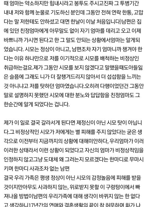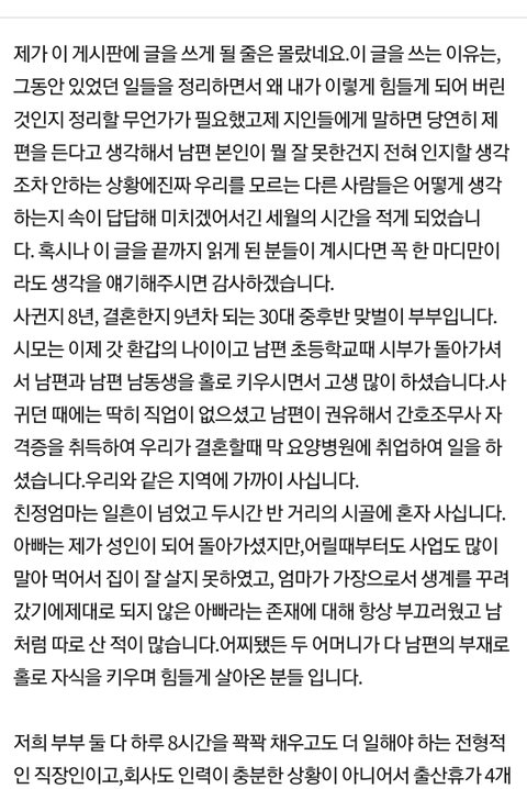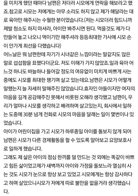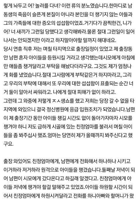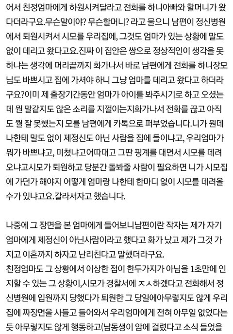 쓰니만 욕할 건 아닌 듯. 애 낳고 키우는 동안 정작 남편은 육아한 게 아무 것도 없네. 시어머니도 제정신일수 있는 상황이 아니지만 당연히 쓰니도 제정신일 상황은 아니었네. 아무것도 안한 남편이 ㅂㅅ 그러나 그 상황에 둘째까지 낳은 건 쓰니 지팔지꼰