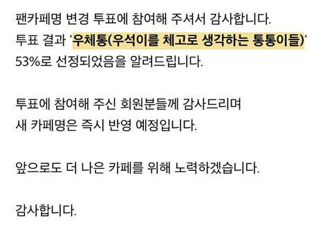 장난으로 지은게 팬까페명이 되버린거구 소속사에서 우체통으로 바꿨다고 공지했어 이처럼 유명해질줄 모르고 본인성과 연상되는걸로 까페명 지었겠지 남자애들 그런 별명 많잖아