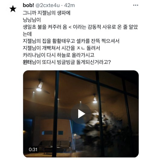 닝이가 불질러놓고 셀카찍고 소파에 누워서 깔깔거려서 지젤 대노함ㅠ;; 그래서 카리나 다시 승천하고 윈터 날라감;;