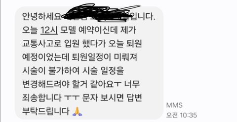 네일 모델 신청해서 그 날짜에 맞춰서 시간 뺐는데 교통사고 났다고 예약한 시간 두시간전에 알려줘서 다른 날로 잡았더니