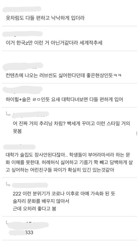 18학번이고 대학원 다녀서 아직까지 학교에있는 화석인데 19년도쯤부터 다들 옷이 좀 헐렁해지더니 그뒤로 지금까지 걍 다 오버핏 입고다님. 하이힐은 진짜 못본 거 같고 높아야 5cm정도 돼보이는 슬링백은 종종 보이는데 대부분 운동화 신고다니는듯..