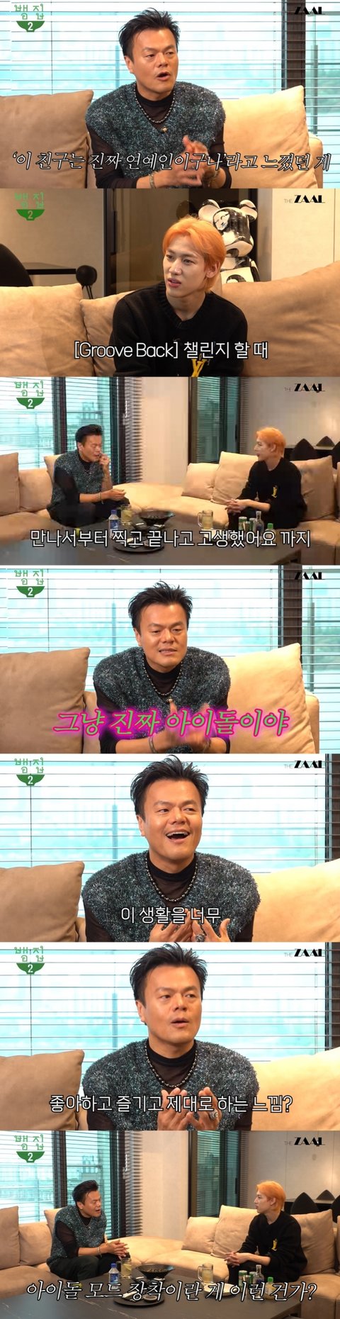 이에 박진영은 "아이돌 할 준비가 된 상태에서 하는 느낌"이라면서 "그게 너무 다르다. 너희 때만 해도 그렇지 않았다. 나는 약간 제일 활동하면서 '이 친구는 진짜 연예인이구나'라고 느꼈던 게 'Groove Back' 챌린지 할 때 장원영이란 친구랑 같이 했는데 만나서부터 찍고 끝나고 고생했어요까지 전부 다 정말 그냥 진짜 아이돌이다. 좋은 의미다"라며 장원영을 향해 엄지를 치켜세웠다.