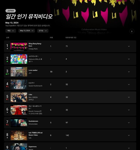 얘들아 일본 유튜브 뮤직 비디오 차트 진입 9위로 시작함