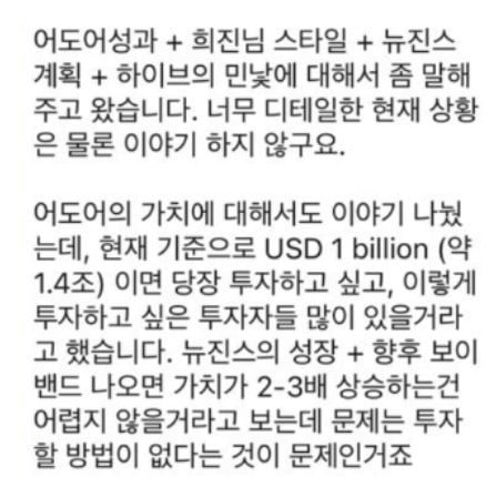이 외국계 투자자는 미팅에서 "어도어의 가치가 현재 기준으로 1.4조원이면 당장 투자하고 싶다"는 취지의 말을 했다고 하이브는 보고 있다. 하이브는 민 대표에게 보고한 어도어 관계자를 감사해 이 미팅과 해당 발언을 파악한 것으로 알려졌다.