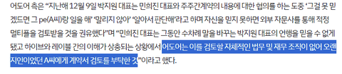 그러나 민 대표 측은 '경영권 탈취 의혹'이 전혀 근거가 없다는 입장이다. 민 대표는 지난달 기자회견에서 "외부 자문사에 자문받았다, 제가 누구를 만나서 어떤 투자를 받았다는데 데리고 와라. 제가 무슨 투자 이야기를 나눴느냐"며 "이는 존재할 수가 없다. 만난 적도 없기 때문"이라고 반박했다.