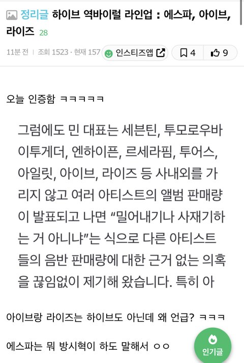 모두까기 또 시작 했구만. 타팬덤 적으로 돌려 봤자 뉴진스한테 좋을거 없을텐데. 민씨는 역시 애들은 안중에도 없는거 맞나 봄.