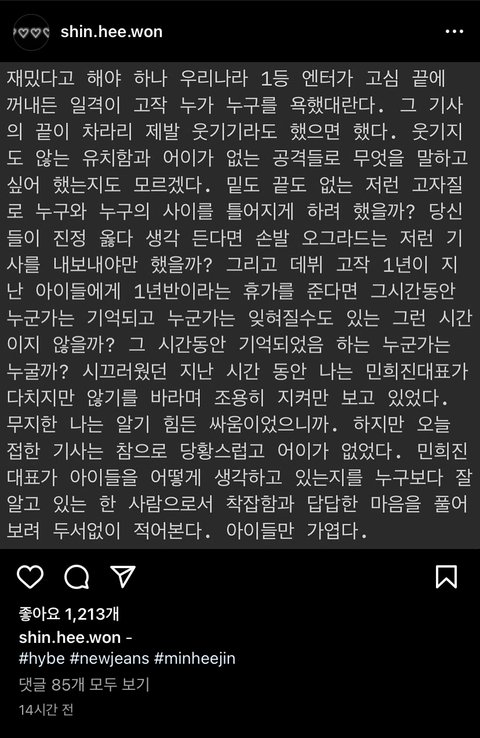 본인 커리어랑 이름 내걸고 하이브 편드는 사람 하나 없는 것만 봐도 차이가 보임 민희진 욕하는 하이브 애들은 다들 블라인드에 숨어가지고 ㅋㅋ