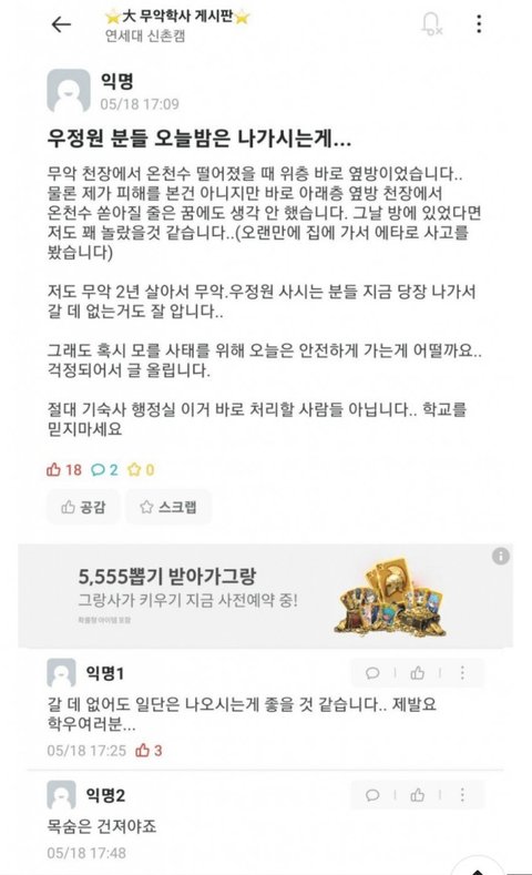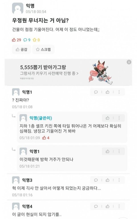 세월호,삼풍백화점 둘다 나가가지 말라는 지시와 여론으로 인해 큰 인명피해가 일어났잖아 몇몇 연세대 학생들은 가만히 있어라, 시대가 어느시댄대 건물이 무너지겠냐 뭐하러 기숙사를 나가냐고 하는데 너무 답답해... 저런 징조면 오늘내일하는데..
