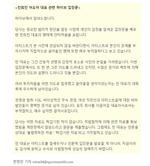 하이브 민 카톡 원본제출 했네ㅋㅋㅋ