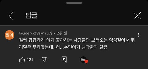 전에도 뭐 신곡 나온거 듣는거 리액션 영상 찍는데도 딴 멤버들이 막 노래 나오니까 막 신나서 뭐라하니까 막 짜증내면서 조용조용!!! 노래 좀 듣자! 이런식으로 말하던데 지가 명문대생이고 나이많고 그룹 내에선 인지도 좀 높은 편이라고 너무 막 대하는듯 누가보면 뭐 아이린급인줄