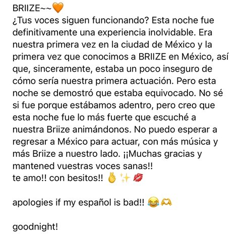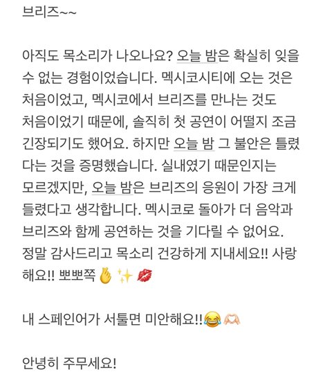 공연 끝나고 스페인어로 현지팬들에게 감사의 글 올림