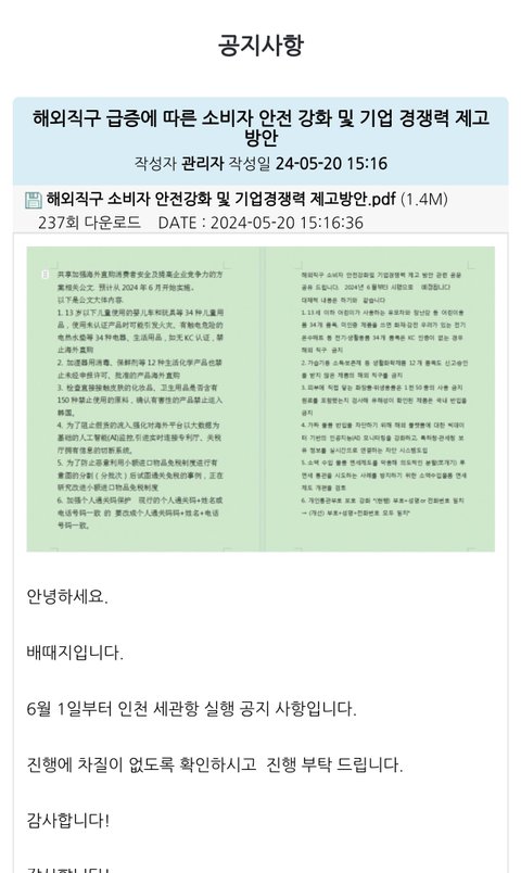 중국 배대지에 올라온 공지
