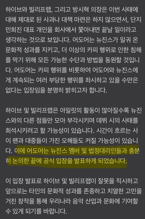 첫 입장문부터 탄원서까지 뉴진스는 한결같이 민희진 편이였음