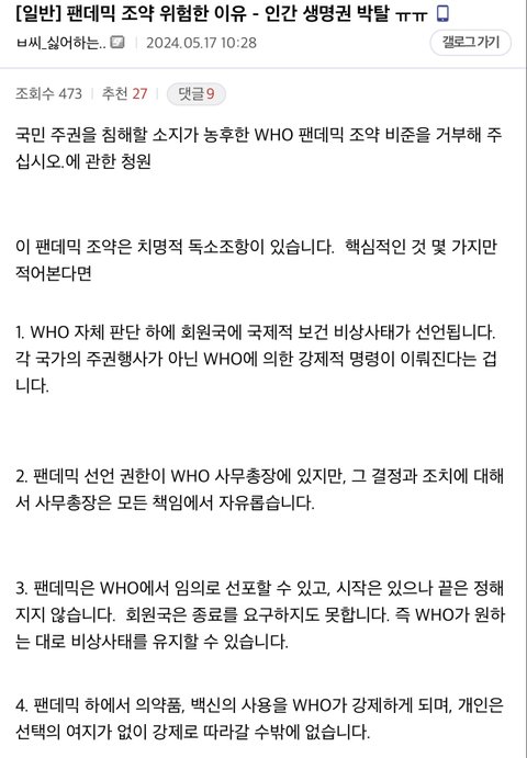 WHO 팬데믹조약 위험한 이유 - 인간 생명권 박탈 ㅜㅜ