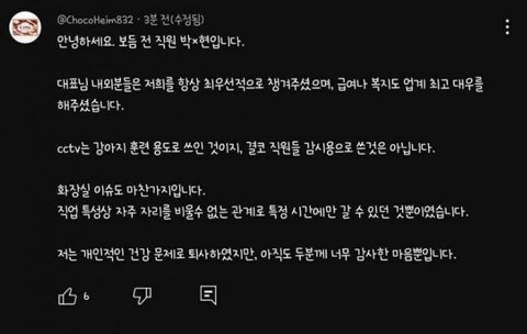 저런 직원 많다 근무시간에 실컷 딴짓하다가 지적 하면 발끈 하면서 에이씨팔 관둔다 하면서 절대 안 나간다