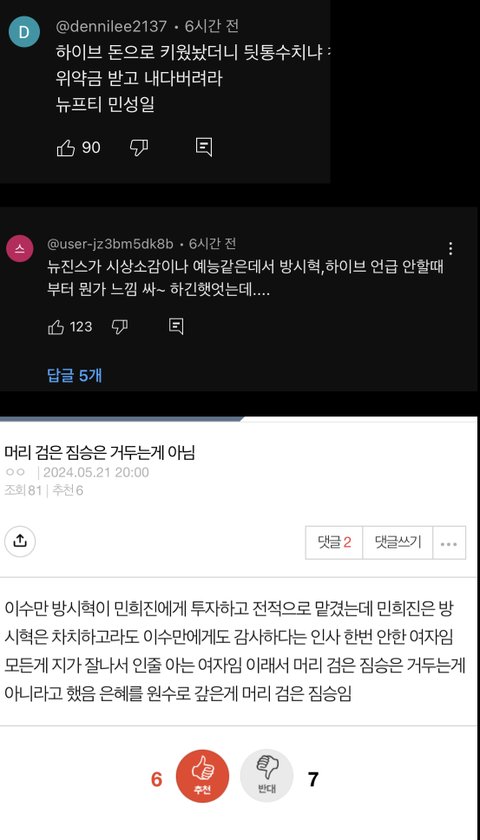 솔직히 민희진 욕하면 다 하이브 알바라 지랄하는데 걍 민희진빠들이 더 알바 같음 민희진 욕하는 사람들은 방시혁 옹호 안 하거든
