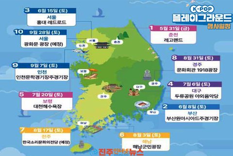 이번 행사는 5월 31일, 춘천(춘천마임축제)을 시작으로, ▴부산(6. 8. 부산원아시아페스티벌), ▴서울 홍대(6. 15. 코리아 뷰티 페스티벌), ▴대구(7. 6. 대구치맥페스티벌), ▴보령(7. 20. 보령머드축제), ▴해남(8. 3. 해남군민광장), ▴전주[8. 17. 세계소리축제(예정)], ▴경주(8. 31. 경주문화회관1918광장), ▴인천(9. 7. 인천K-POP콘서트), ▴서울 광화문[9. 28. 광화문광장(예정)] 등 총 10개 지역에서 펼쳐 ‘한국방문의 해’의 환대 분위기를 전국적으로 확산할 예정이다.