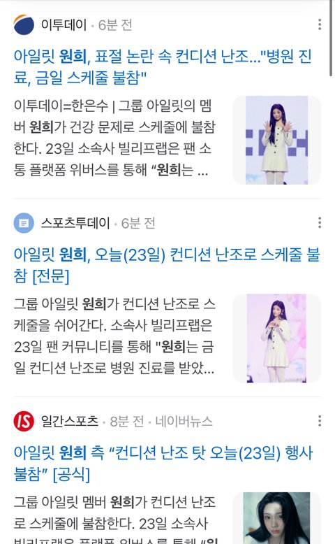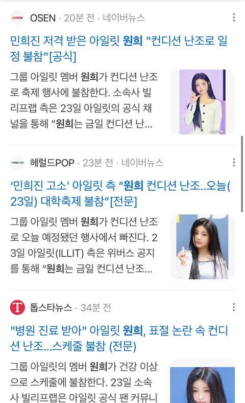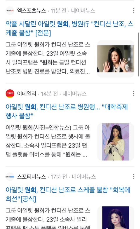 같은 날 뜬 하이브 걸그룹 아일릿 원희 프로미스나인 지헌 행사 스케줄 불참 기사 수.jpg