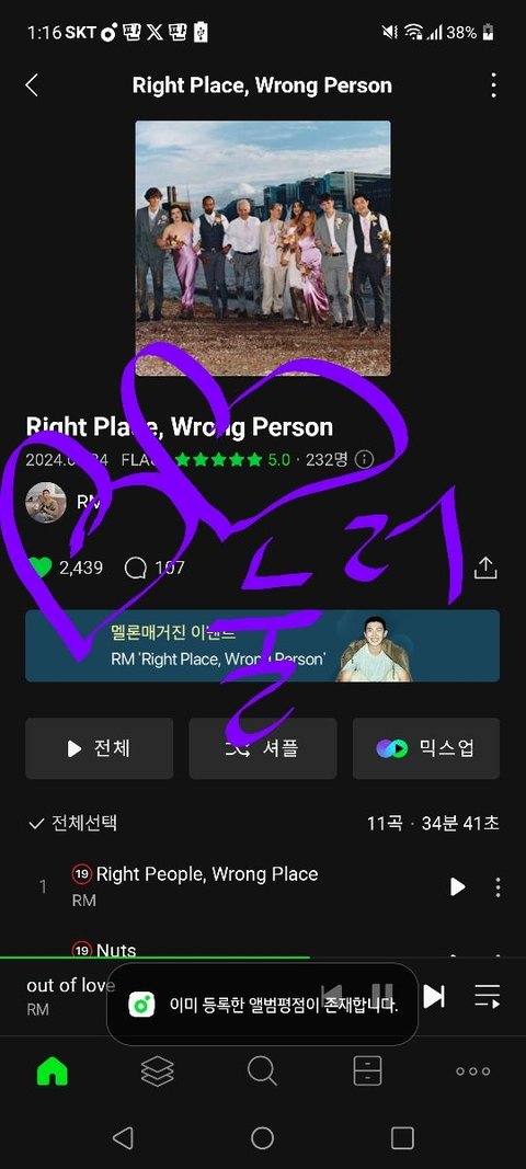 곡이랑 앨범의 하트,별5개평점누르기