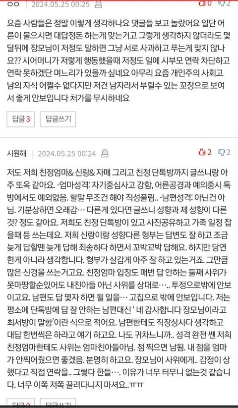 다들 베플만 보고 제 글의 핵심을 잘 파악 못하시는 분들이 많은 것 같아요. 핵심은 친정 단톡방에 사위가 들어왔는지가 아니라 남편의 예의범절 그 자체에요. 제 글의 핵심을 잘 파악하신 댓글 몇개 올려볼게요. 베플뿐만 아니라 아래 댓글도 같이 보고 판단해주세요.