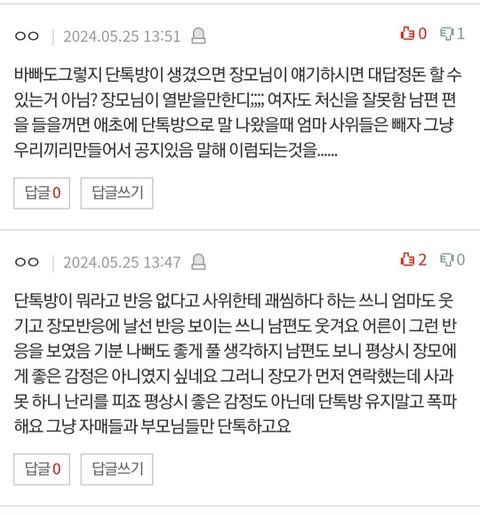 또 저보고 시댁 단톡방에 들어가라는 분들도 계신데, 저도 그 단톡방 들어가는거 상관없으나 애초에 남편과 시부모가 저 단톡방 들어오면 불편하다고 거부한거에요. 제가 들어가고 싶어도 못 들어가요.