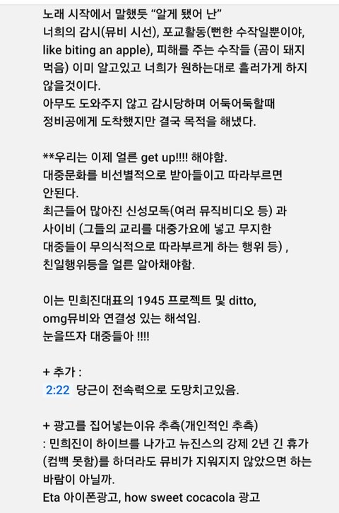 행복한 꿈도 잠시, 마지막에서 다시 어두운 장면으로 전환됨. 물에 잠긴 오리와 함께 걸어나오는 뉴진스. 그리고 우리를 바라보며 뮤비 끝. 무엇을 전하고 싶은 걸까?