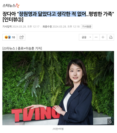 이날 장다아는 데뷔 전 '장원영 친언니'로 알려진 점에 대해 부담감을 털어놓으며 "내 의지와는 상관 없이 알려져 배우로서 자리를 잡으면 '장원영 친언니'라는 수식어는 차츰 없어지지 않을까 싶다. 이러한 수식어가 사라지길 바란다"라고 고백했다.