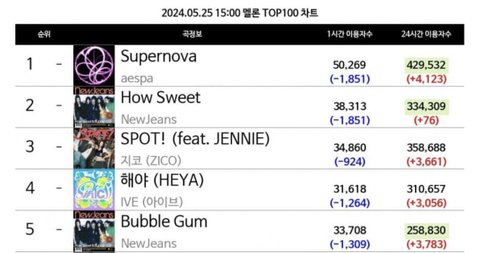 아이유가 홀씨로 차트 1위 못한것부터가 충격이었는데 뉴진스도 1위를 못하고 있네 그 뉴진스를 꺾은게 에스파라는게 ㅈㄴ 반전임