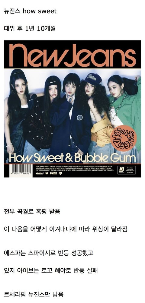 하입보이 디토까지 ㄹㅇ좋았는데 오엠지는 걍그랬고 소신발언하자면 eta는 그룹이름빨로 올려치기 히트친거지 곡자체는 너무구렸음 하우스윗 어케되려나