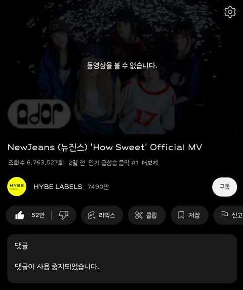 하이브가 뉴진스 뮤비랑 일본데뷔 영상에 연령제한 걸어나서 10대들 못보게 설정되어있음 ㅅㅂ 대체 우리애들이 뭘 그렇게 잘못했냐?????