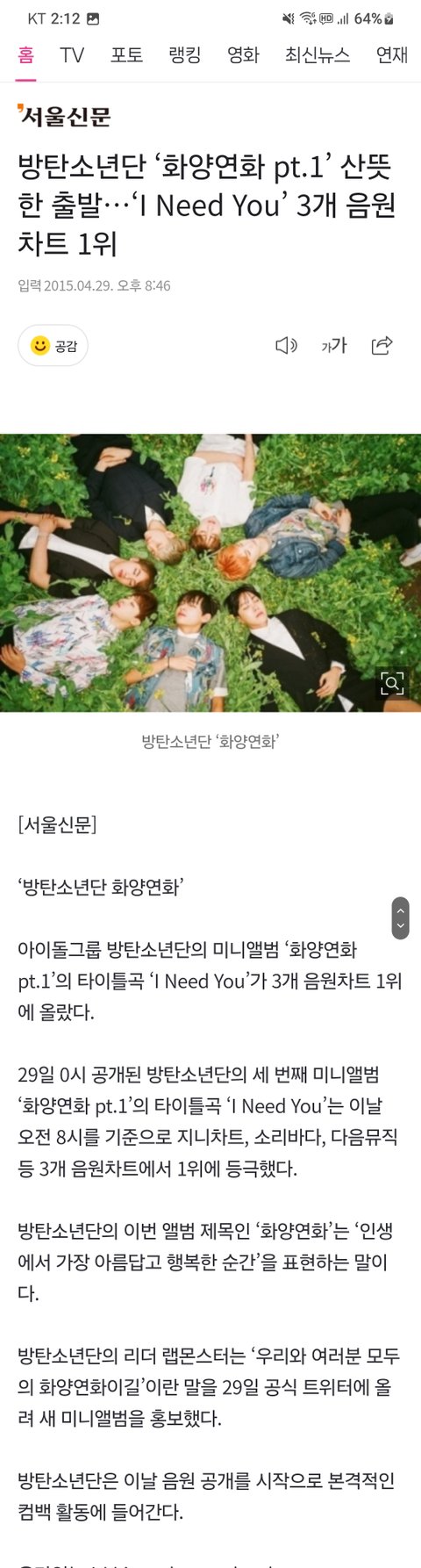 오랜만에 공카 들어가서 FROM.BTS 스크롤 쭉 내려서 보는데 애들 아니쥬 활동할 때 음방 첫1위 소감들도 있고 당시에 공카 회원 10만 찍어서 멤버들 와주고 이게 다 기억에 남아있는데...진짜 지금 상황이 생각할수록 어이가 없다 자정에 음원 공개되고 나서 1시 차트에서 멜론 지니 진입 2위, 엠넷은 1위 찍고 2시 차트에 다 2위여서 그거 보고 행복하게 잠들었던 기억이 있거든 검색 조금만 해도 자료로 다 나올거야. 아침에 이렇게 기사 뜬 것도 있었다고.. 이전 앨범 댄져, 솔직히 난 개취로 다크앤와일드 수록곡도 다 너무 좋았고, 첫 정규였지만 아허라 찍으면서 준비한 애들 고생 너무 많이 했던 앨범이라 되게 좀 아픈 손가락인데 그거 진입 50위대였나 그랬다가 차트 아웃 좀 빠르게 됐어서 그거랑 비교해서 50위 하던 가수가 어떻게 1위로 진입할 수가 있냐는데 와 환장한다 진짜 판결문 끝까지 제대로 안읽고 ㅅㅈㄱ라는 단어에 꽂혀서 미쳐버리겠음 회사가 지들끼리 싸우는데 정신 팔려서 해명 똑바로 안하니깐 걍 이때다 싶어서 또 어떻게든 흠집 내보려고 끌어 내려보려고 하는 것도 너무 익숙한 패턴이라 해탈한다 진심 우리 리더 1년 넘게 열심히 준비한 앨범, 페스타, 그리고 우리 첫째 전역 앞두고 저 짓을 한달 넘게 하고 있다는게 생각할수록 놀라워 그냥 뭐만 하면 오래된 아미들은 다 알고있었데, 근데 라이징 하는 시기니깐 다들 쉬쉬하고 묻어뒀었데 이러는데 뭘 얼마나 더 오래된 팬이어야 사실들을 알고 있는거임? 나는 아미 아닌가? 진짜 기가찬다