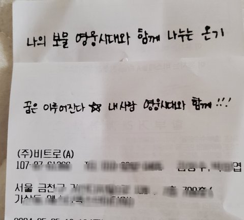 MD 구매하면 영수증에 임영웅 자필 멘트 찍혀나옴