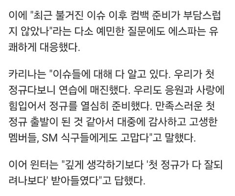여기 알바들 또 몰려왔네ㅋㅋ 윈터가 뜬금없이 웃은게 아니라 기자들이 하이브 사태에서 에스파 언급된거 관련 질문하니까 윈터가 다 잘되려나보다 하고 받아들였다고 하면서 의연하게 잘 넘어간것같은데 뭐가 문제임 으휴