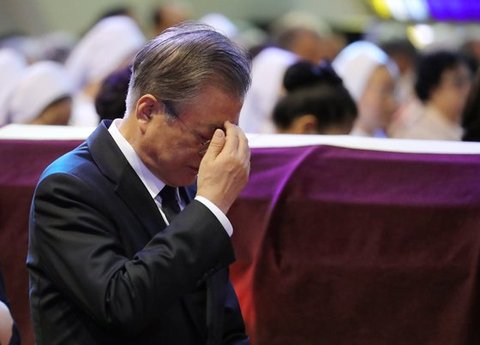 (사진4 설명) 문재인 대통령이 31일 오전 부산 남천성당에서 모친 고 강한옥 여사 장례미사에 참석해 성호를 긋고 있다. <연합뉴스>