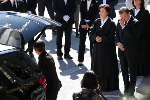 (사진6 설명) 문재인 대통령과 부인 김정숙 여사가 31일 오전 부산 남천동 남천성당에서 열린 대통령의 어머니 고 강한옥 여사 장례 미사 뒤 고인이 운구차에 모셔지는 것을 바라보며 눈물을 훔치고 있다. <뉴스1>
