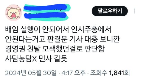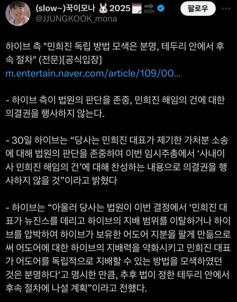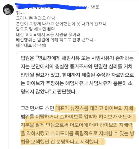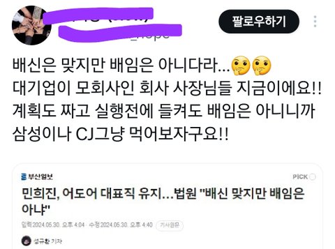판에서 기생하는 개저씨 하루에 글 몇개씀? 하이브 민희진 누가 이기든 노관심이니까 저 계정가서 따져 일반화 시키지 말고요