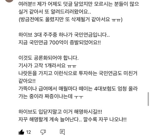 나 하이브 싫어하는데 ㅋㅋㅋ원래 국민연금은 원래 여기저기 투자해서 수익보거나 날리는거 개많음.. 예전에 국민연금이 마이너스의 손이라는 말도 나왔었고 ㅋㅋㅋㅋㅋ 제작년에는 주식 투자 총액 30조원 줄어들었다고 기사 떴었음. 다른데서 수익 보면서 굴리기도 할테고 하이브 주가 오르면 또 이익은 보겠지만 애초에 불안정한 엔터사에 투자하는건 별로 좋아보이진 않음 나도 주식 굴리는거 있는데 엔터주는 피곤해서 손이 안감.