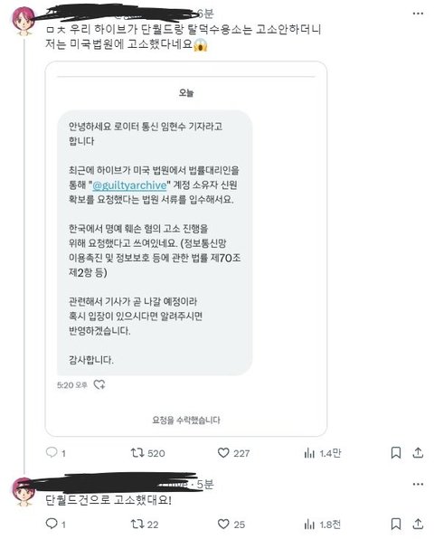 ㅎㅇㅂ가 특정 x계정 미국 법원에 신원공개 요청했대